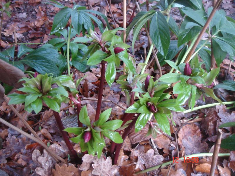 Weitere Helleboren ( Kultivar " Pink Lady " und welche aus der Ice an Roses Serie ) haben sich bei der milden Witterung ebenfalls schon weit vorgetraut.