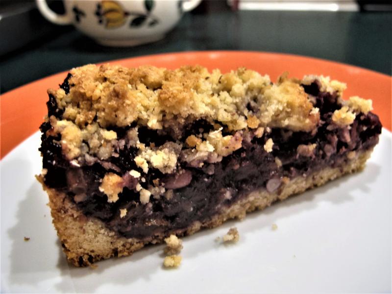 bei der gelegenheit: die klare suppe mit den kasnudeln hat etwas unheimlich vampirisches – wenn man diese kasnudeln noch in eine stabile form bringen könnte, hirnförmig oder embryonenhaft, es wäre betörend abartig, genial für jede schwarze messe... und die italienische apfeltorte sieht so dunkelfruchtig aus, dass ich mich frage, wieviel trockenfeigen, pflaumen, datteln oder getrocknete weinbeeren da auch noch drin sind – das würde auch als blaubeerkuchen durchgehen?!