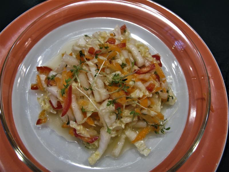 Ach ja, heute Chinakohlpaprikakarottezwiebelkressesalat süßsauerscharf, danach Linsen mit Semmelknödl
