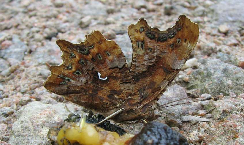 C-Falter Polygonia c-albumDer C-Falter erreicht eine Flügelspannweite von 40 bis 50 Millimeter. Die weiße c-ähnliche Zeichnung auf der schwarz-braunen Flügelunterseite gab dem Falter seinen Namen. Die Oberseite der Flügel ist rostfarben mit dunklen Flecken. Die Flügel sind tief ausgeschnitten, fast zerfranzt.