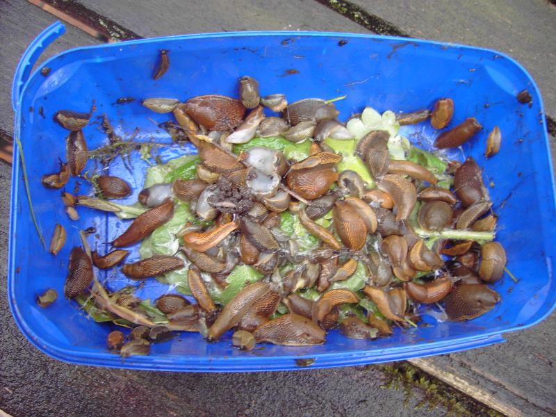 Was auch gut hilft, ist: Rhabarber pflanzen. ;) Die Stangen ernten und essen und die abgeschnittenen Blätter auslegen. Darunter sammeln sie sich wirklich in Massen und mampfen Löcher in das Rhabarberlaub. Der Anziehungsmagnet schlechthin. Hier und in den darauffolgenden 2 Posts habe ich es beschrieben. Leider sind die Fotos durch die Umstellung auf einen neuen Server bei pur wohl abhanden gekommen. Mal schauen, ob ich sie noch habe.