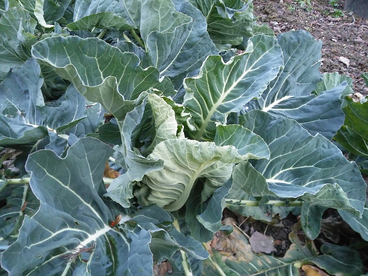 Beim Winterblumenkohl ist zu sehen dass er wieder deutlich anfängt zu wachsen. Bis jetzt ist er überraschend gesund, nur unten ein paar faule Blätter.
