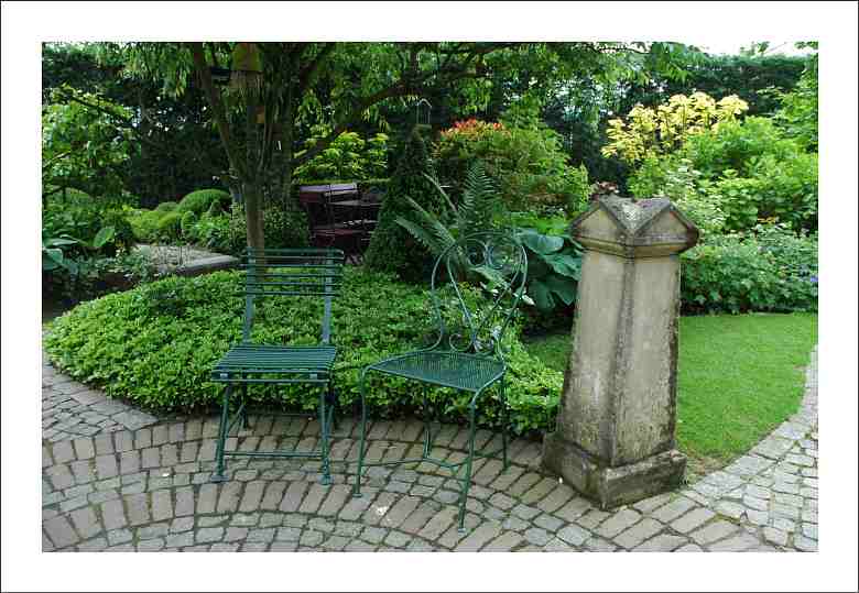Das fanden wir auch, trotz der Arbeit beim Schneiden :D :D :D. Aber beides berühigt ja. Das Schneiden und die Farbe Grün ;D!Im Ernst und für jeden Pflanzensammler ein Thema: Der Garten ist schon bunt genug und eine Buchs- oder Eibenhecke bringt viel Ruhe hinein und läßt manche Staude besser zur Wirkung kommen.So, nun ist aber wohl wieder mein Typ gefragt die Gartenreise fortsetzen zu dürfen.In der Tat fotografiere ich ja nicht nur die Sitzgelegenheiten, man muß sie ja auch zur Probe mal besitzen ;) :D. Und nachdem die Schuhe abgelaufen, die Hosen im Kniebereich abgewetzt sind vom vielen Niederknien beim Fotografieren (nicht nur wegen Faulpelz ;D), braucht es mal wieder eine Pause.Wie Ihr seht, laufen ja auch Pur-Fotografinnen durch's Bild :o - durch die Kamera anonymisiert versteht sich ... ;D