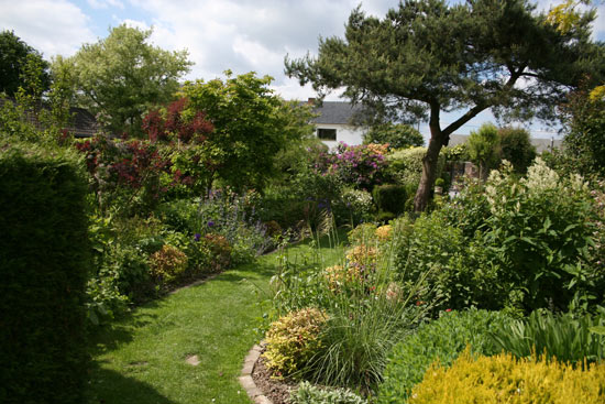 Interessant war auch, wie die Besitzer das an sich flache Gartenstück mit Wegen abseits des mittleren sich schlingernden Rasenbandes abwechslungsreich mit Lauben und Treppen (Hügel - wahrscheinlich vom Aushub der Teiche entstanden) gestaltet haben.