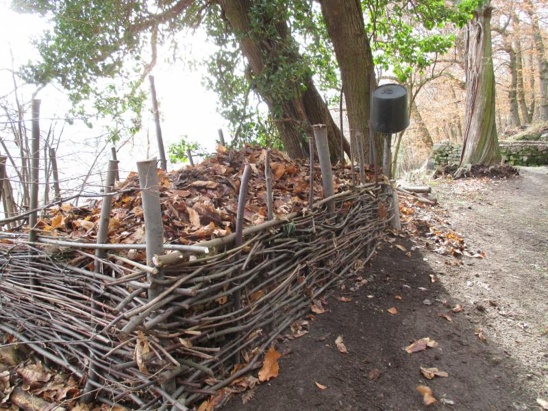 Auch wenn manch eine sich wundert, für das anfallende Laub auf Treppen und Waldwegen habe ich diesen Kompostplatz. Die Seiten sollen noch weiter geflochten werden. Ich schneide dazu die einjährigen Austriebe der Kastanien. So sind die dann auch untergebracht.