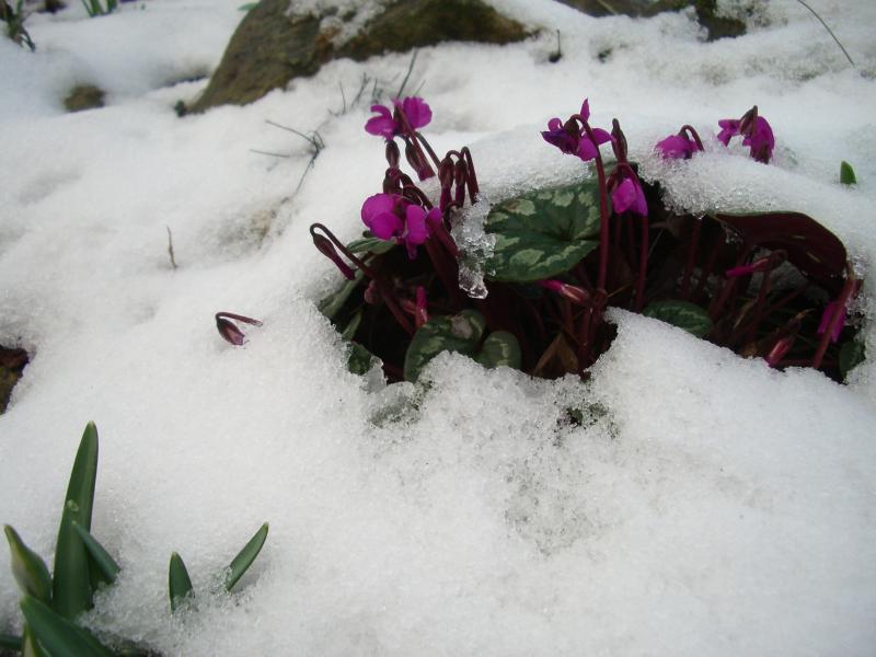 Hier kämpft sich mühsam ein Cyclamen coum durch die Schneedecke.