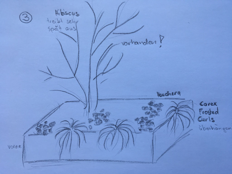 Völlig winterfest, auch im Trog, sind Hosta. Die sind zwar nicht immergrün, machen aber mit Laub und Blüte was her. Könnte man vielleicht noch ein paar mit einbauen...und den Sonnenschutz/die Verträglichkeit berücksichtigen. Deine Zeichnungen und die Ideen finde ich gut. Als Bodendecker könnte man, sofern keine Gierschphobie vorliegt, einen Trog mit dem weiß panaschierten bepflanzen.