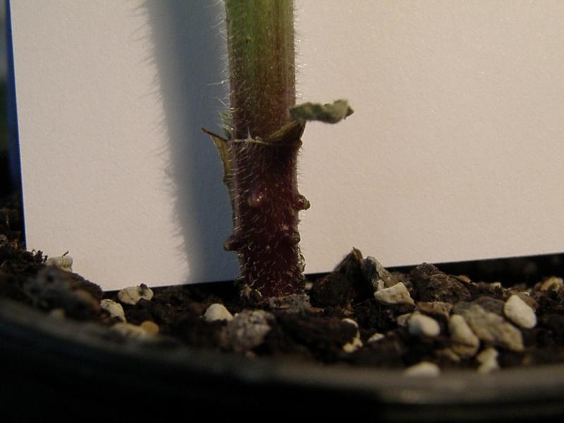 Auf dem Foto sind nun an dem einzelnen Hauptstamm keine Wurzelansätze mehr zu sehen. Eigentlich hoffe ich auch darauf, dass sich neue Stockaustriebe/Seitentriebe zeigen, so dass ich den Haupttrieb der Pflanze schon vor dem Auspflanzen im Mai kappen kann, um diesen dann in Wasser bewurzeln zu können (von dieser Sorte haben ich bisher nur diese eine Pflanze)