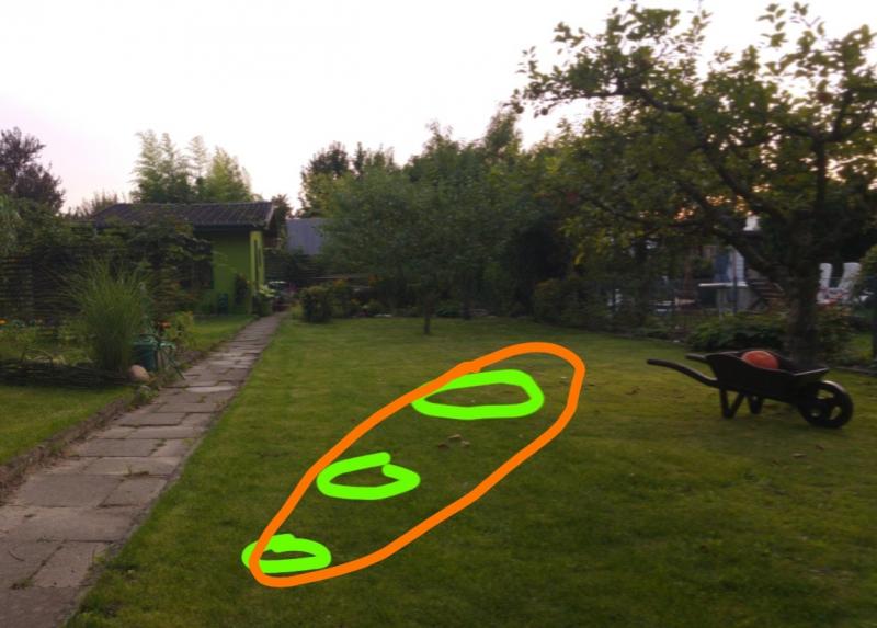 Die Stauden wandern dafür alle in ein großes Inselbeet im Rasen, wo ich bisher schon 3 kleine habe (grüne Ovale), die nun durch Erweiterung zu einem zusammengelegt werden sollen.