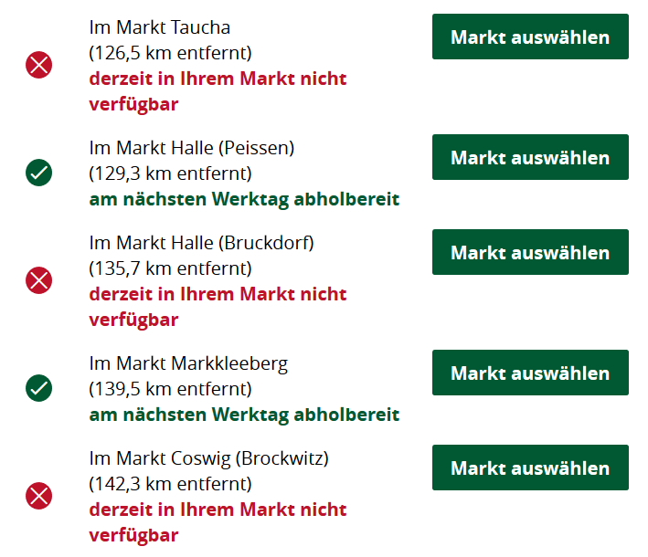 Für mich wäre es z.B. im Markt Markkleeberg verfügbar, so 140 km wech.