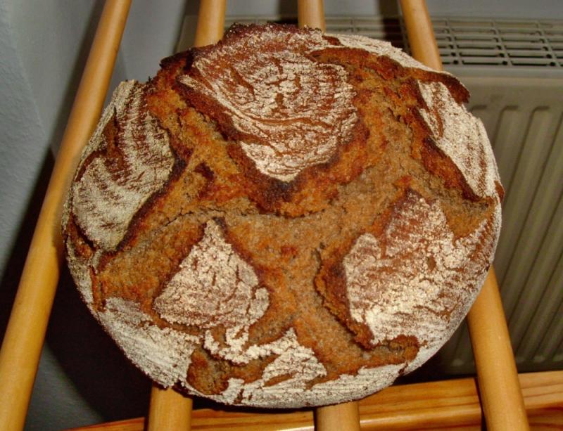Durch eure Backaktivitäten animmiert, habe ich meinen trocken gelagerten RoggenSauerteig reanimiert. Alles lief recht gut - bis ich beim Backen nach 10min zwar den Wecker auf 30min umstellte, aber nicht die Temperatur zurück nahm ::)