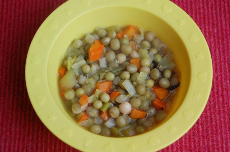 Erbseneintopf (trockene Erbsen, Selleriestange, Möhre, Porree, Salz, Speckfett, Majoran)