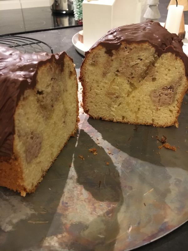 Rührkuchenteig in die Form, die von Weihnachten übrig gebliebene Vermicellimasse (gekochte Maronen, Puderzucker, Vanillezucker, Milch zusammen püriert) eingestrudelt wie beim Marmorkuchen und gebacken.