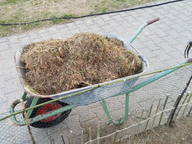 Um die habe ich mich heute angefangen zu kümmern, durch Vertikutieren. Knapp die Hälfte der Rasenfläche, und 5 solcher Schubkarrenladungen sind zusammengekommen