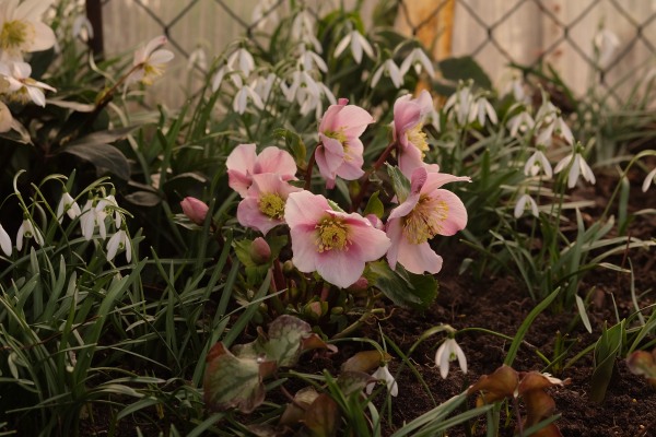 Helleborus x ericsmithii 'Balthasar' blüht seit Ende Dezember. Schnee und Frost machte selbst den Blüten nichts aus.