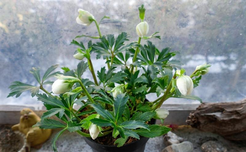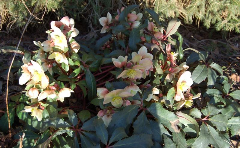 Helleborus x ericsmithii 'Balthasar' blüht seit Ende Dezember. Schnee und Frost machte selbst den Blüten nichts aus.