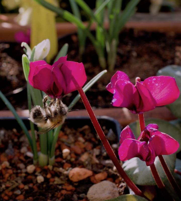 Und eine Biene macht Klimmzüge am silberlaubigen, dunkelblütigen coum. Sonnenlicht macht es heller, als es ist.