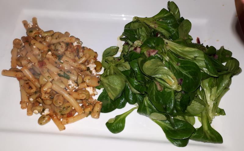 Hier fanden sich im zu räumenden Tiefkühlfach je ein Stück Filet vom Schwein und vom Hendl, die wurden geschnetzelt, in Paprikazwiebelsauce mit etwas Weißwein gedünstet und zuletzt mit einem Stäubchen Mehl, ein paar Champignons und Sauerrahm versehen. Dazu Reis und grüner Salat.