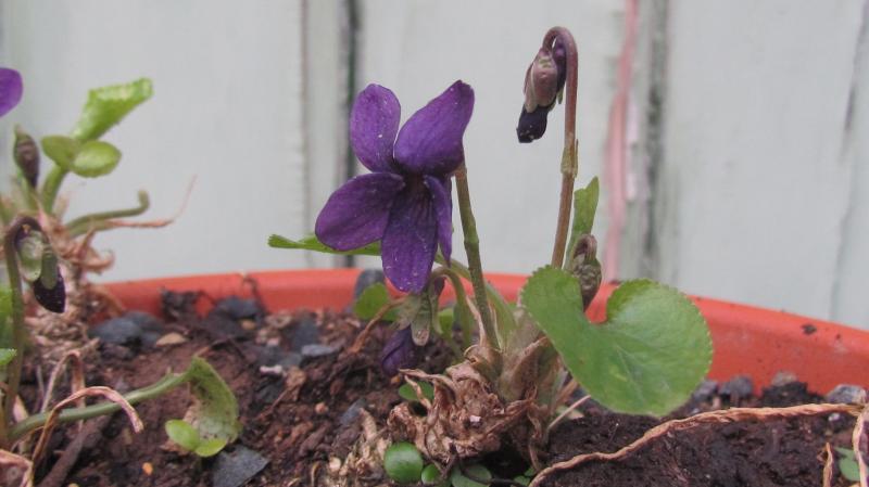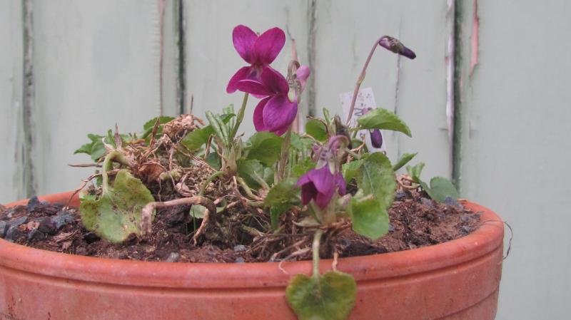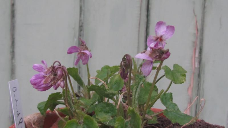 Bei ein paar Töpfen mit lilarosa Veilchen sind die Blüten irgendwie deformiert. Da sie alle fast gleich/sehr ähnlich aussehen und die betreffenden Sorten teilweise eigentlich anders blühen sollten, vermute ich einen Veilchentyp dahinter, dessen Blütenanlagen in sehr frühem Stadium sehr frostempfindlich sind. Hier `Orchid Pink´, das scheint zu stimmen.