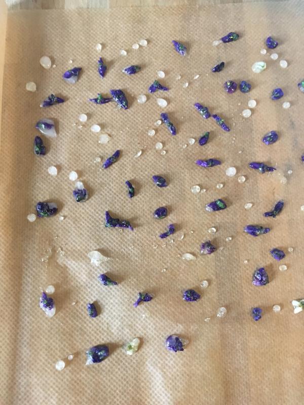 Weil ich endlich genug habe, habe ich heute ein paar kandiert. Die vier rosa-violetten Töne (Alice, Charlotte, Oktopus, CdA) sind leider nicht mehr unterscheidbar.