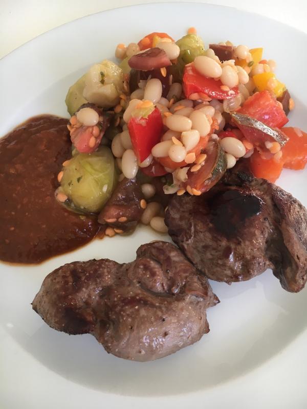 Hier gabs auch weiße Bohnen. In einem Gemüsesalat :D Dazu gabs Rinderfilet und Tomatenchutney.