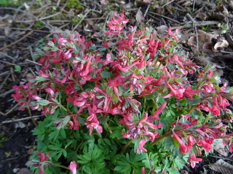 Ich hatte ursprünglich nur die violetten Corydalis aus dem Wald. Weil die mir farblich zu langweilig waren habe ich einige GPBakers dazwischengepflanzt (und noch eine rote Sorte, auf die ich gerade nicht komme), seitdem wird das Beet sehr viel bunter, weil viele rote Sämlinge auftauchen.