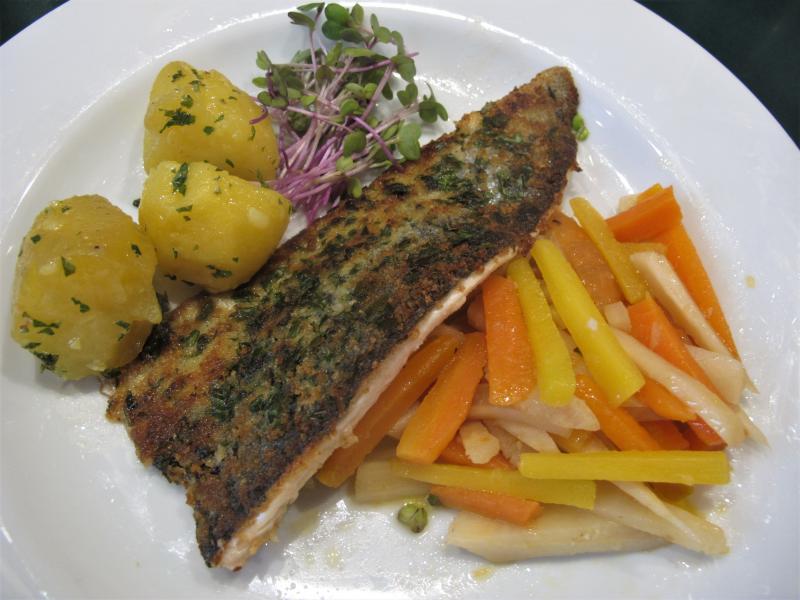 Hier gab es Seeforellenfilet mit marinierten Wurzeln (Rest vom Sonntag) und Petersilerdäpfeln.