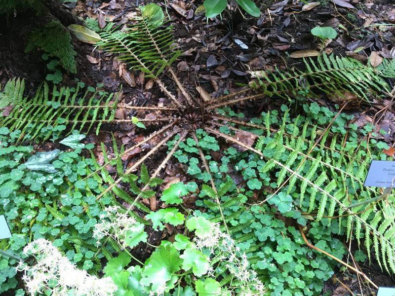 Am allerschärfsten finde ich diesbezüglich Polystichum retrosopaleaceum (Danke, Brissel!): Er bildet genau eine Reihe Wedel, wie Matteuccia. Irgendwann im Herbst bilden sie ein Scharnier an der Wedelbasis, und einer nach dem andern liegen flach am Boden, bleiben aber schön grün. Ich nenne ihn für mich Klappfarn.