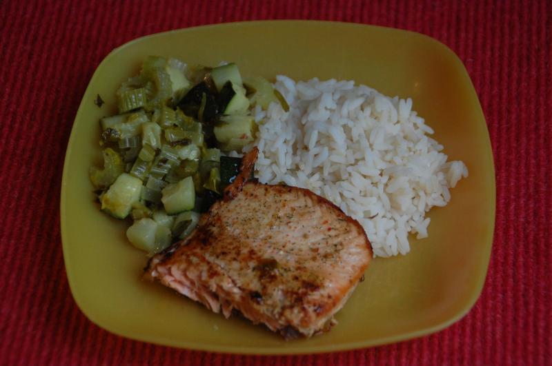norwegisch gewürzter Wildlachs, Kaffirlimettenreis und Stangensellerie-Zucchini-Gemüse