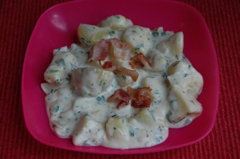 Pellkartoffeln in Sahnesoße (Knoblauch- und Zwiebelwürfel, Pellkartoffeln, Mehlschwitze, Milch, Sahne, Petersilie, Dill, Muskat, S&P) mit Frühstücksspeck - lecker :D