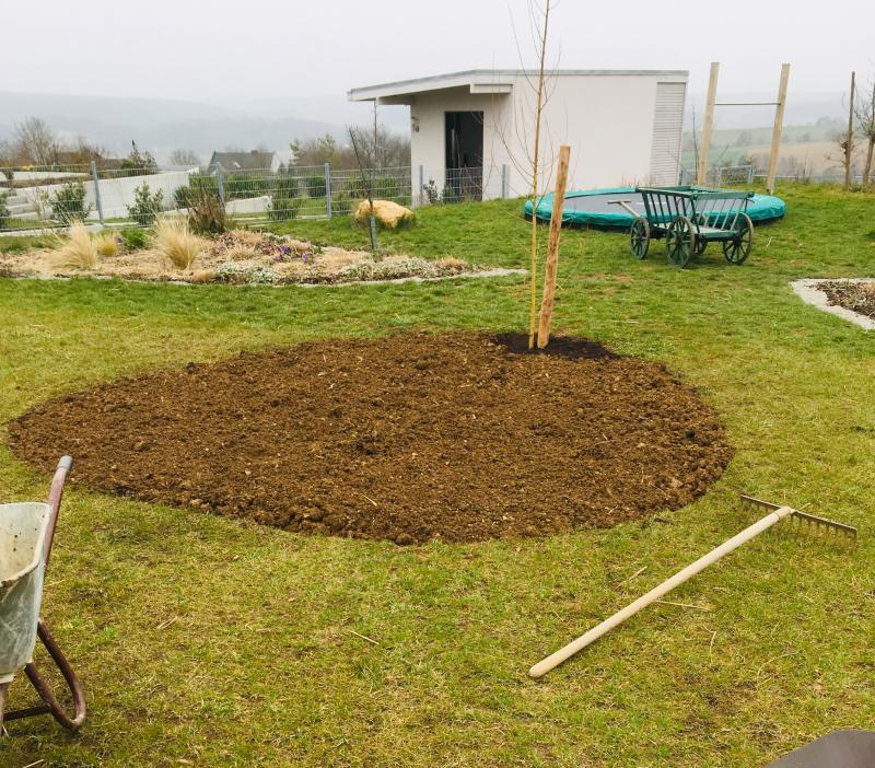 So. Nach vielen Stunden der Vorbereitung, inklusive ungezählter Erdschubkarren, hier nun das fertige Beet. Erstmal von weitem zur Übersicht