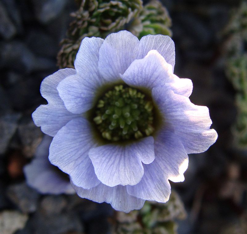 Der steht im sonnigen Steingarten. Wenn es morgen mal etwas besseres Wetter ist, kann ich ja mal von der Seite fotografieren. Heute muss es erstmal ein Bild von Callianthemum anemonoides tun, die ebenfalls im sonnigen Kalkschotter steht.