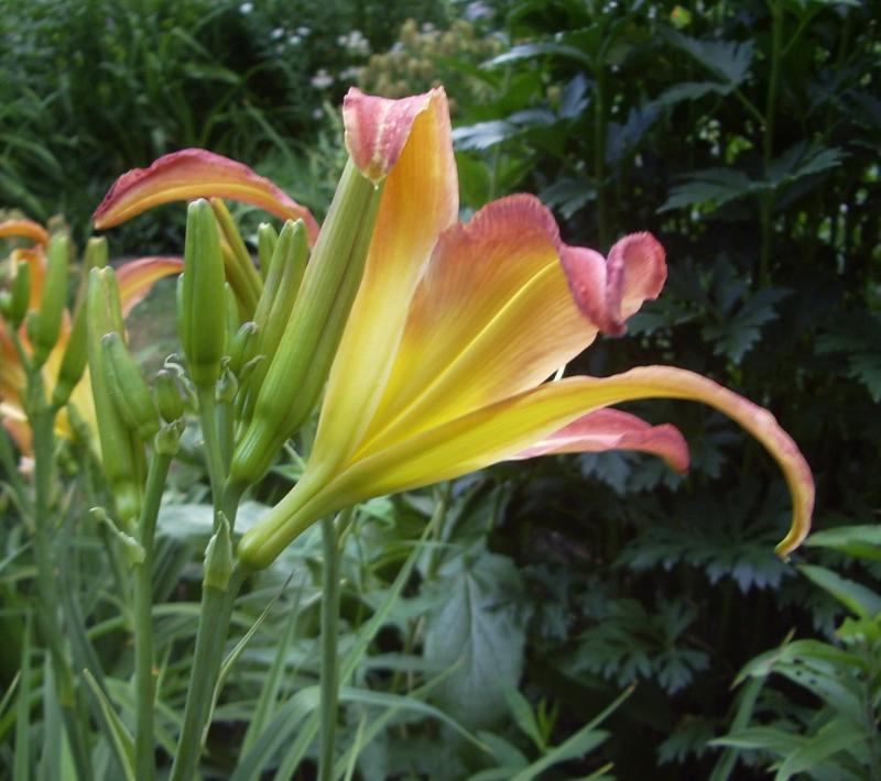 ... und habt damit unbeabsichtigt den Bogen zu einem anderen Sämling geschlagen, mit dem ich nun auch schon ein paar Jahre rumeiere. Wieder sind viele gute Eigenschaften in einer Pflanze vereinigt, selten habe ich eine Taglilie im Gesamthabitus als so wohlproportioniert empfunden, aber wieder einmal liegt die Crux in der Blüte. Allerdings nicht im Öffnungsverhalten, denn dieses ist dem Typus "lilienblütig" entsprechend, sondern im Blütengesicht, welches einfach nichts von der Farbreinheit besitzt, die ich persönlich mir bei einer Taglilie wünsche. Dennoch kann ich mich nicht trennen, weil mich die Rück- und Seitenansicht immer wieder bezirzt. Der "Gartenname" des Sämlings kommt also nicht von ungefähr... 8)