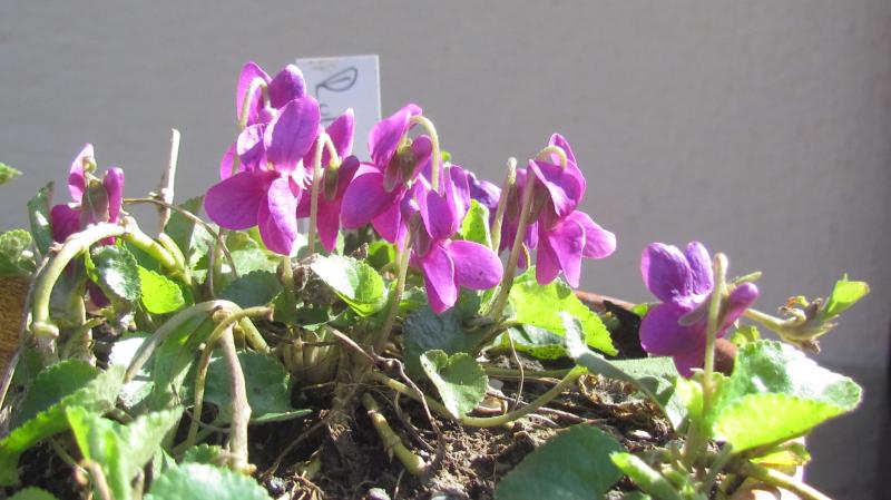 Weiter vorne hatte ich mal was von gleich aussehenden lilarosa Veilchen mit verkrumpelten Blüten geschrieben, bei denen ich eine hohe Frostempfindlichkeit der Blütenanlagen vermutete. Letzteres scheint immer noch so, allmählich werden aber doch teilweise feine Unterschiede zwischen den einzelnen Sorten sichtbar, eine davon ist `Dick o' the Hills´.