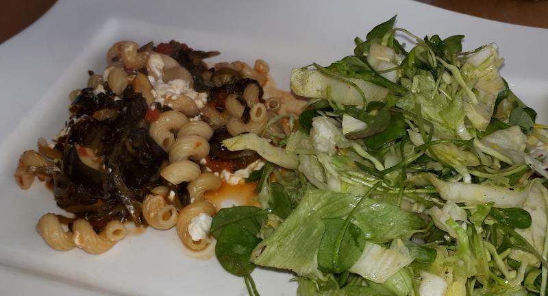 Korkenziehernudel mit Zucchini, Bärlauch und Tomaten, dazu Salat aus Eisberg, Postelein, Chicoree und Spitzkohl