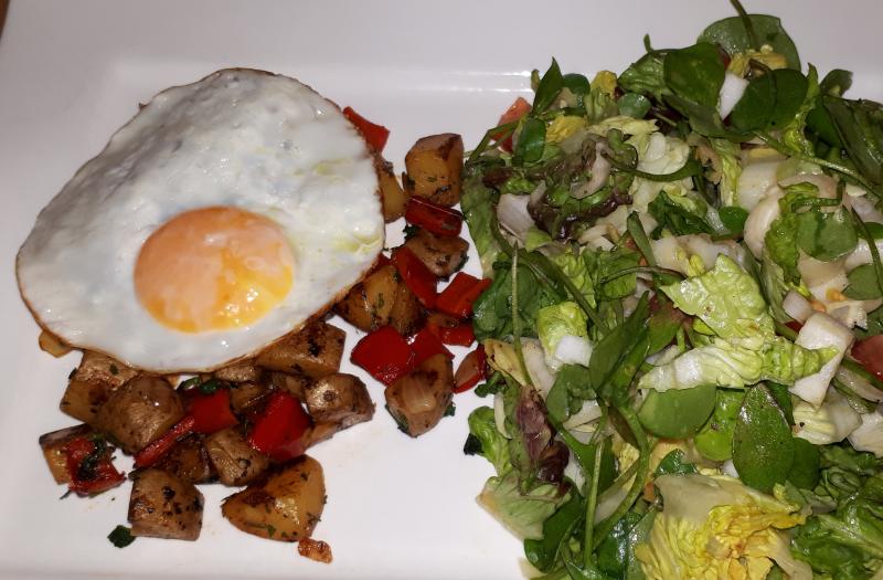 Roh gebratene Kartoffeln mit Paprika und Zwiebeln, Spiegelei, verschiedene Blattsalate mit Tomaten