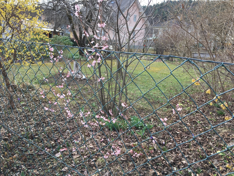 So - hier ist ein eher schlechtes Foto, weil durch den Zaun auch noch durch. Benachbart mit Cornus mas Jolico links und Chimonanthus praecox rechts.