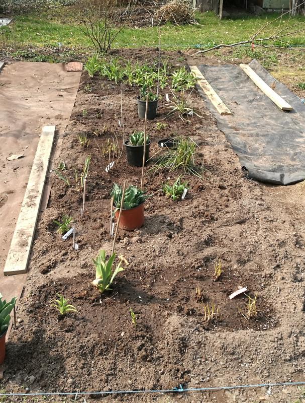 Heute endlich die Basisbepflanzung für einen Streifen in meinem orangenen Beet hingekriegt. In den letzten Wochen habe ich den Streifen total durchgebuddelt und was noch lebte an Pflanzen aufgenommen. Das waren vor allem Hemerocallis fulva, Pseudolysimachion Hermannhof, Kniphofia Alcazar und K gaipinii. Aus den Batzen alle Quecke rausgefielselt und heute flächig verteilt. Dazu noch ein paar Iris, Lilien, neue Kniphofias und die notgetopften Tulpen (bleiben im Topf). Ja und einen Eremurus aus Mannheim. Nun fehlt noch niedriges Füllmaterial und Mulch. Nach vier Stunden war ich platt.