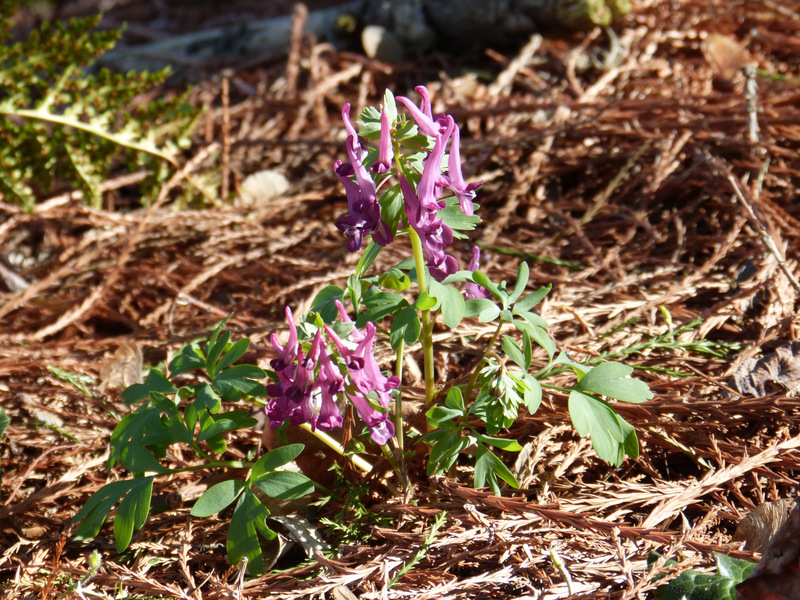 Corydalis sheareri blüht. C. buschii treibt aus, der erste, noch zusammengeballte Blütenstand ist erkennbar.