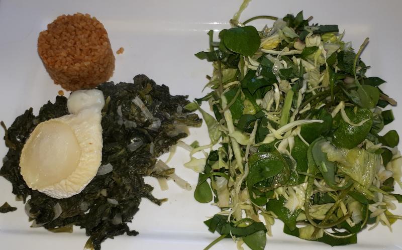 Bulgur mit Neuseeländer Spinat (Der TK leert sich sichtbar) und gebackener Ziegenkäse, dazu Salat aus Rucola, Radieschenblättern,Eisberg, Postelein, Bärlauch und Spitzkohl.