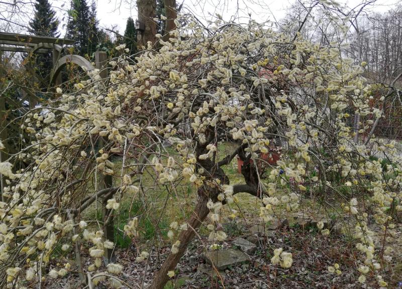 Das Besondere an diesen Stämmchen ist die „Trauerform“ zur Blüte. Schneide ich die kätzchrentragenden Triebe vor der Blüte ab, habe ich ganzjährig ein grünes Ding im Garten. Ich würde den Kopf stark auslichten und nur ein paar grüne, treibende Stummel stehen lassen. Wenn die Weide vital ist, wachsen dort im Laufe dieses Jahres lange Triebe, die im kommenden Frühjahr gelb blühen.