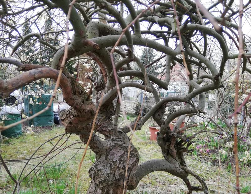 Ich wäre da eiskalt und würde 10cm über der Veredlung die Säge ansetzen. Bis zum Wochenende sollte das gemacht sein, dann kann sie von unten neu austreiben und es gibt im nächsten Jahr dann auch ein paar mehr Blüten als die handvoll jetzt. Zudem ist danach die verwuschelte Frisur weg und man kann das Bäumchen jedes Jahr nach der Blüte recht kräftig zurücknehmen.