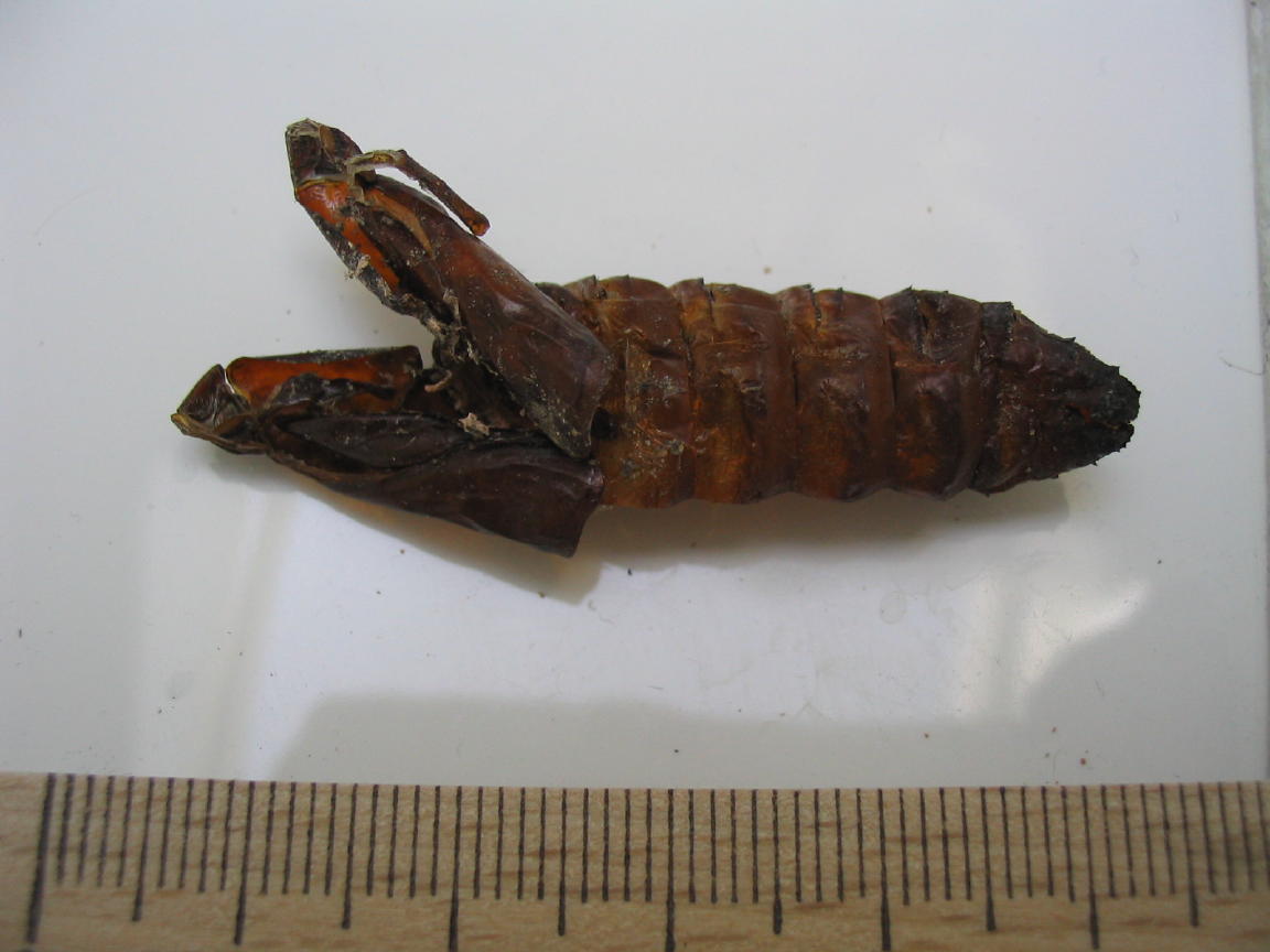 Welcher Kaefer(?) hat in dieser Chitinhuelle drin gesteckt:recht stabil, insgesamt 6cm lang, 1 cm breit, zigarrenfoermig, mit deutlichen Ringen, "hinten" = am dicken Ende mit zwei paddelformigen Anhaengseln (1cm lang) nebeneinander, frisch glaenzend fuchsbraun. Lag oben auf der nackten Erde eines Beets, mit einem eigentlich viel zu grossen Erdloch nahebei.Alle meine Nahaufnahmen sind leider komplett verwackelt.