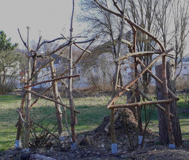 Im Herbst hatten wir zwei größere Kiefern gefällt. In jeder wuchs ein Rambler, die bereits im Sommer aus den Bäumen "operiert" und sehr stark zurück geschnitten wurden. Seither wuchsen sie krakenartig über den Boden.