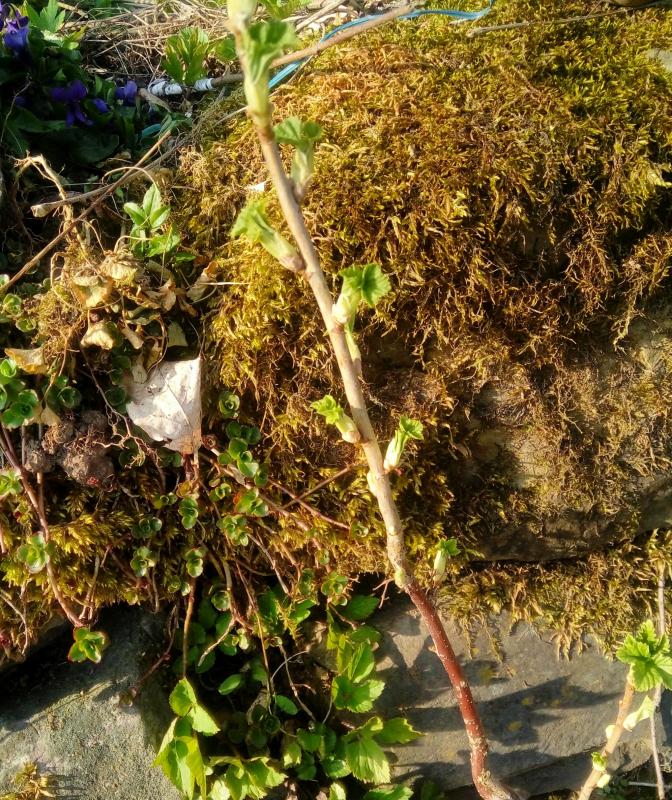 Hier ein Bild des Austriebs der Premiere. Luberas rotblättrige schwarze Johannisbeere. Wie bei Lubera beschrieben, soll die Pflanze sonnig stehen, damit sie im Sommer ihr rotes Laub bilden kann.