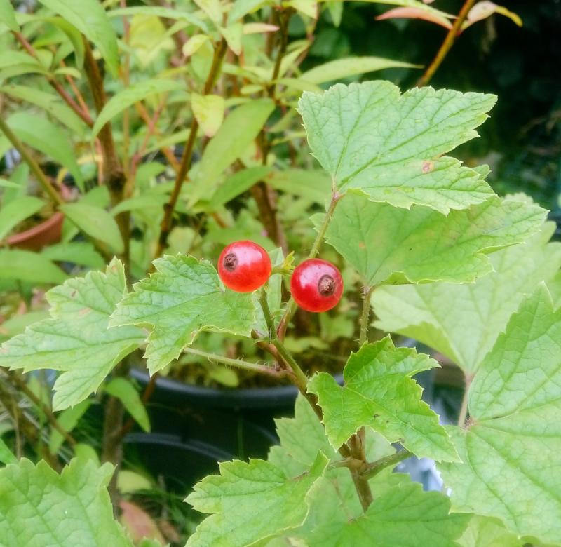 Habe heute die erste, dunklere, im Bild die rechte, Beere, der am diesjährigen Holz fruchtende Johannisbeere, verkostet. Sauer, aromatisch, also eine typische rote Jb ;D
