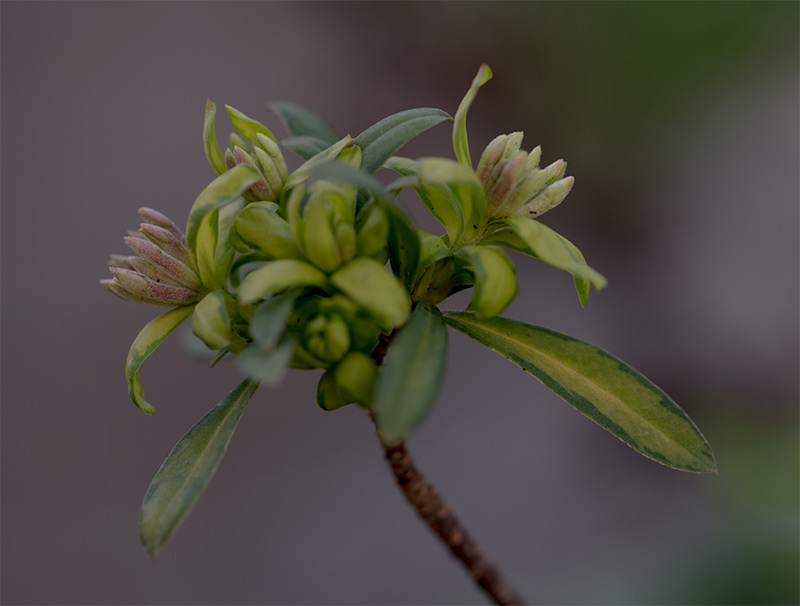 Daphne x burkwoodii ‘Golden Treasure’, gerade mal 20 cm und will schon blühen.