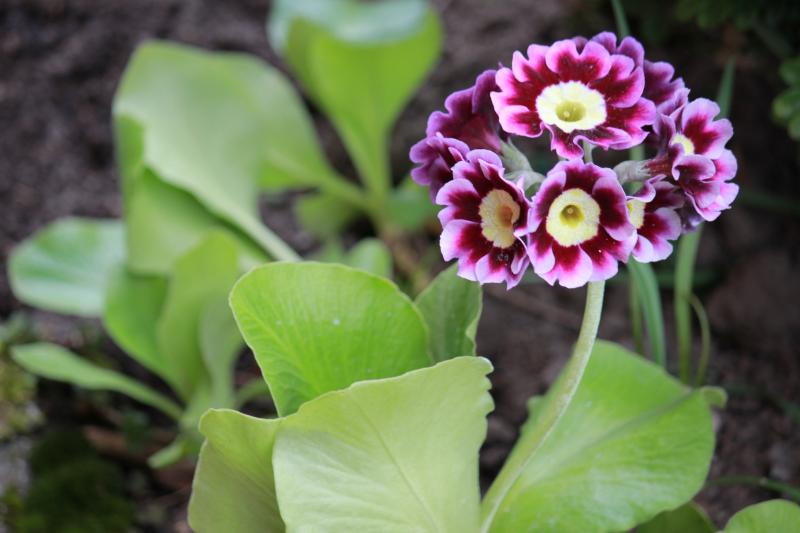 Die Gartenaurikeln müssen hier alle mit dem Beet vorliebnehmen, da der Platz für Pflanztöpfe immer knapper wird. Sie vermehren sich aber dort prima und zeigen sehr gesundes Blattwerk. Allerdings blühen sie hier deutlich später, ca. Mitte April. (Foto 2018)