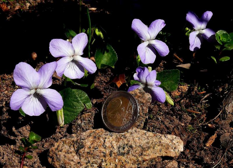 Meinen Viola riviniana-Typ habe ich vor Jahren am Straßenrand gefunden. Er ist besonders großblütig und zu Beginn der Blütezeit nur 3-5 cm hoch.