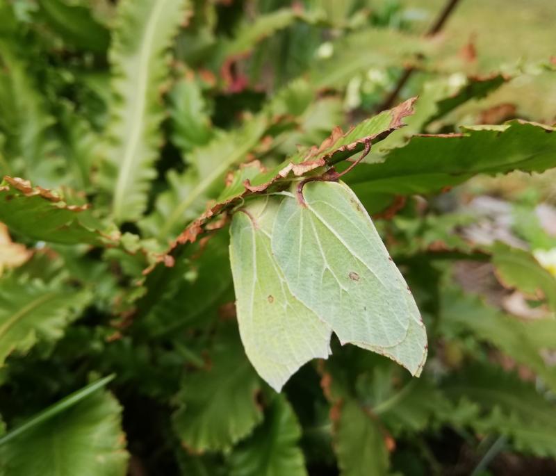 Gestern allerdings sah ich einen Zitronenfalter, der sich fürchterlich an einem hellgrünen Stecketikett abmühte.